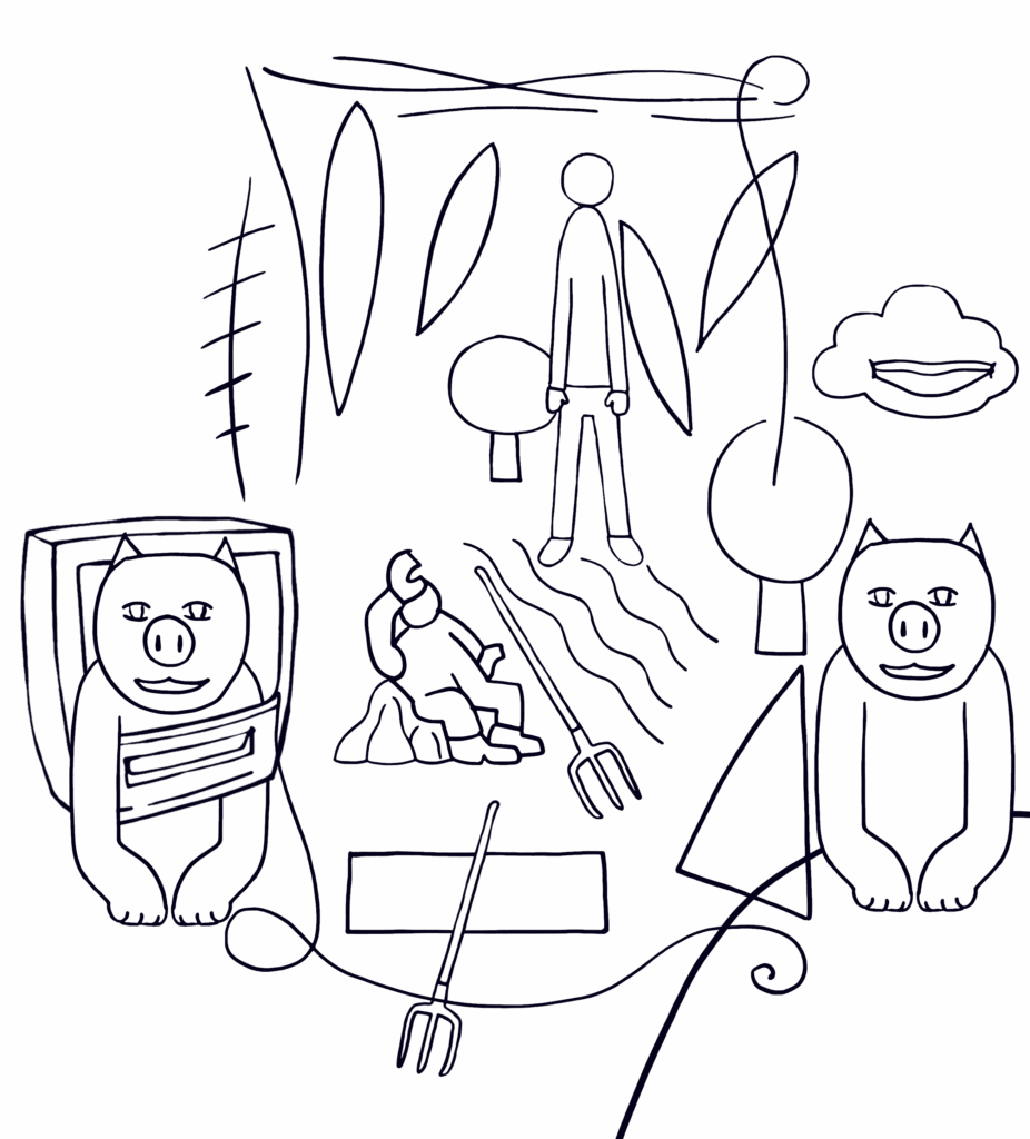 Dessins comme ça vient. Représentations graphiques d’objets et de scènes. Projets de peintures. Reflets en noir et blanc d’un monde où se mêle d’un trait continu le numérique et le paysage géométrisé avec ou sans personnage.